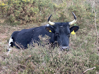 Youngsters 217, 220, 222, 230 and yearlings 270 and 271 were all lying down, resting and chewing their cud around ///ropes.scout.hears at 14:55. Older steer 21 was munching on gorse nearby. Oddly, there was no sign of older steer 35, so I started to search the surrounding area for him. About twenty minutes later, the steers started to get up and soon joined steer 21 in grazing.