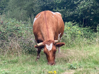 Fifteen of the original Caesar's cows were at the cow shed at 09:40 this morning. Most were actually in the shed, where they were relaxing and chewing their cud. Cow 940 was lying down, resting. Older steers 21 and 35 were both grazing on the far side of the little wooden bridge. Yearling 270 was grazing at the back of the cow shed, but he soon came round and said hello. The cows were all happy, relaxed and looking well.
